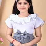 A prominent grey bow adorns the waistline, serving as a decorative element and providing a clear division between the white top and the grey skirt.