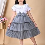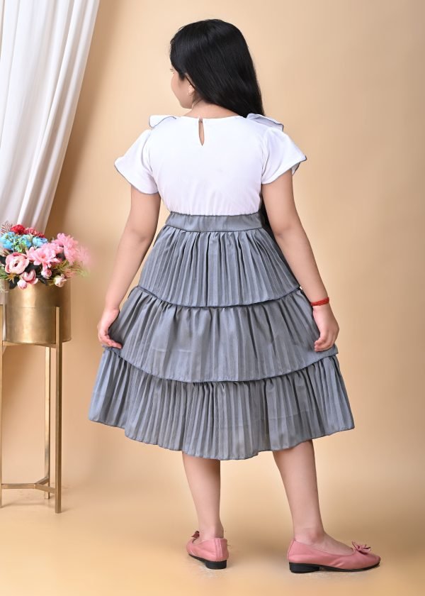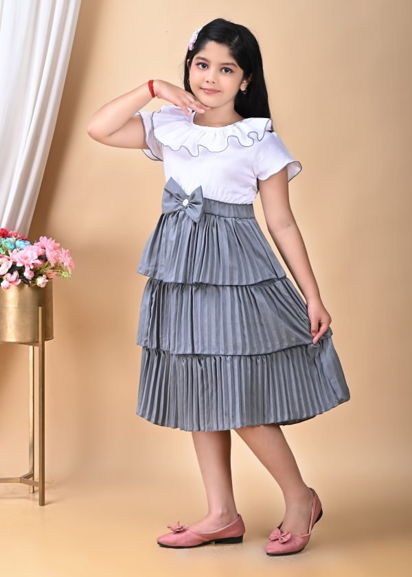 This is  a charming and stylish dress for a young girl, featuring a two-tone design with a white top and a grey pleated bottom.