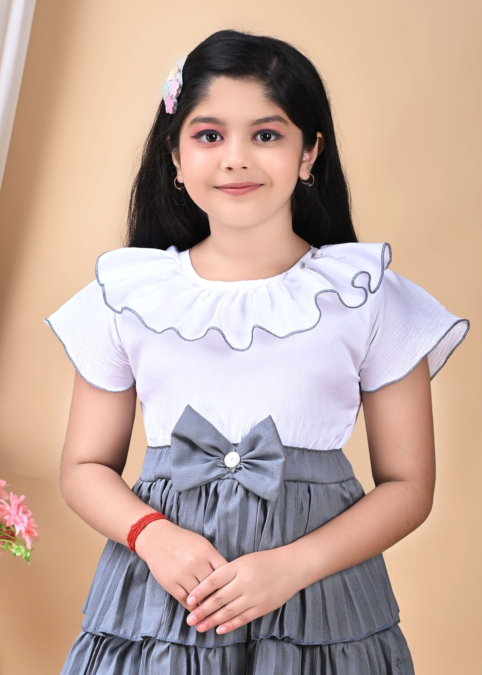 This is  a charming and stylish dress for a young girl, featuring a two-tone design with a white top and a grey pleated bottom.
