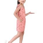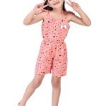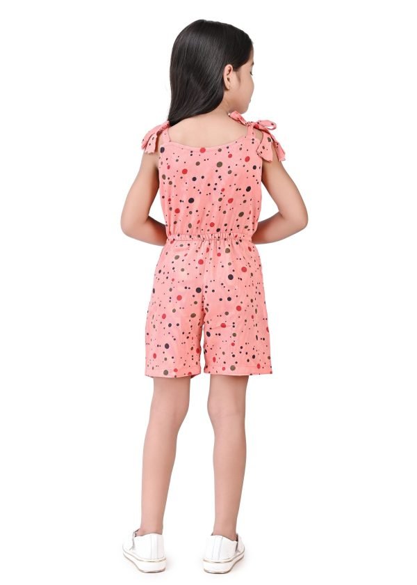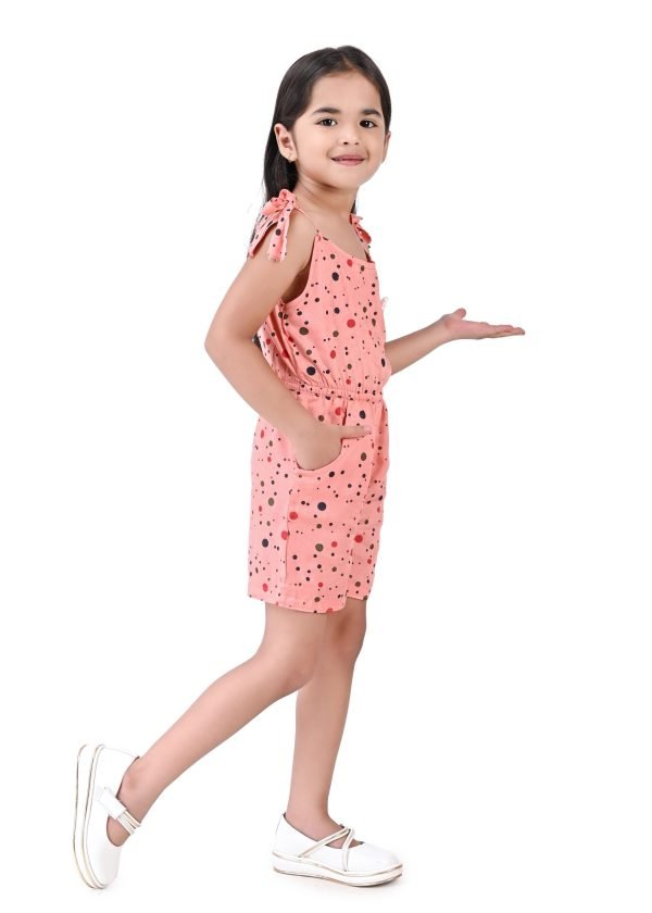 This charming girls’ jumpsuit, perfect for warm weather, features a delightful peach  base adorned with a playful scattering of multi-coloured polka dots in shades of black, red, and blue. The design incorporates a comfortable, sleeveless silhouette with tie-up shoulder straps, adding a sweet and adjustable detail. A small, contrasting  bow accentuates the bodice, providing a touch of whimsical charm.