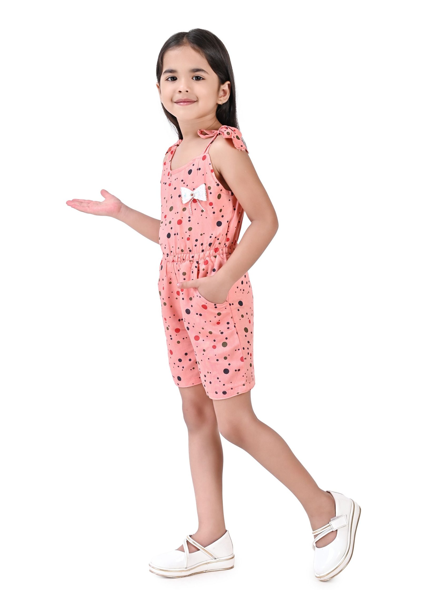 This charming girls’ jumpsuit, perfect for warm weather, features a delightful peach  base adorned with a playful scattering of multi-coloured polka dots in shades of black, red, and blue. The design incorporates a comfortable, sleeveless silhouette with tie-up shoulder straps, adding a sweet and adjustable detail. A small, contrasting  bow accentuates the bodice, providing a touch of whimsical charm.