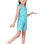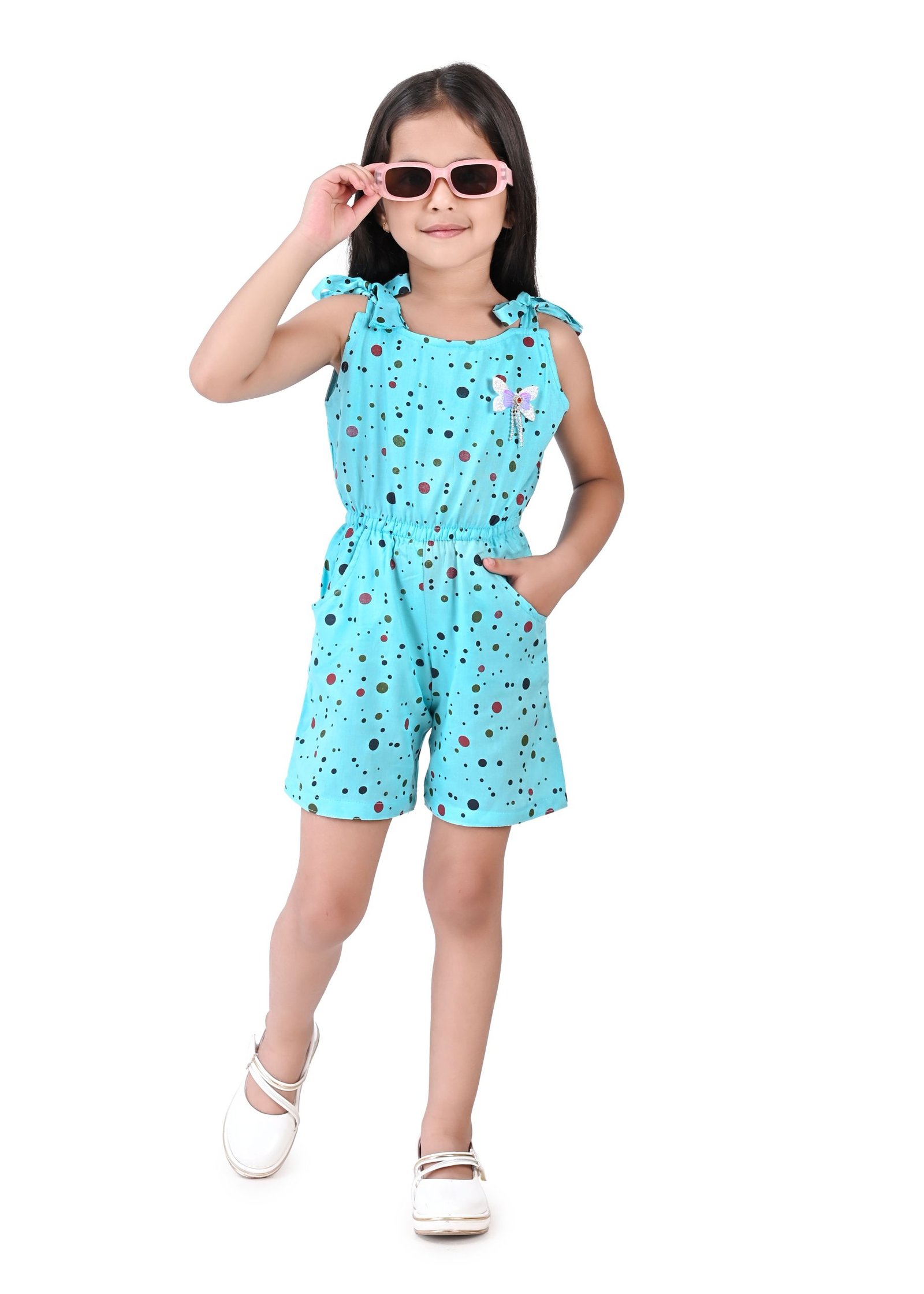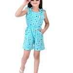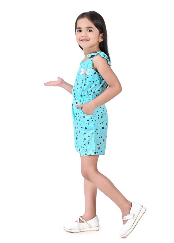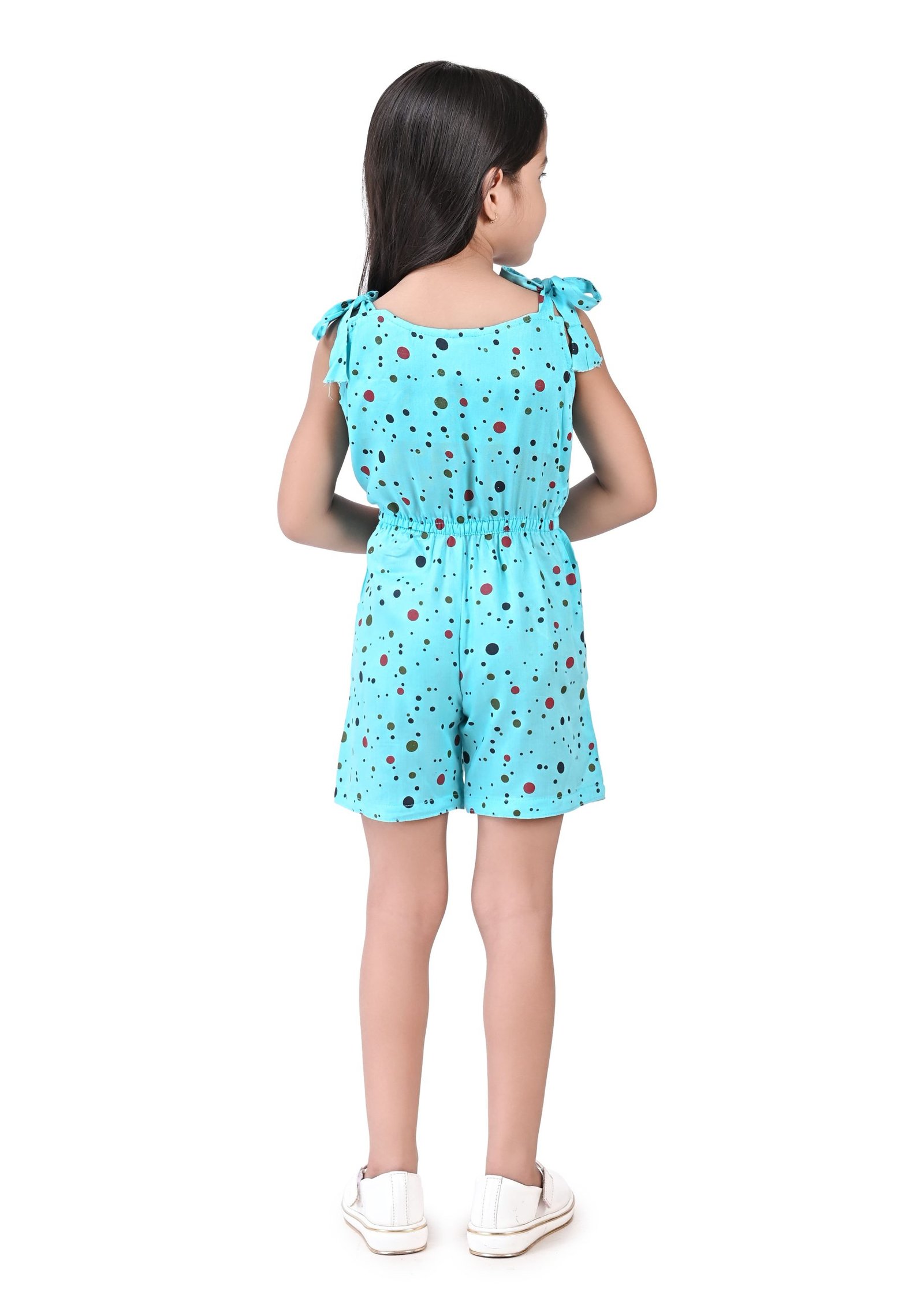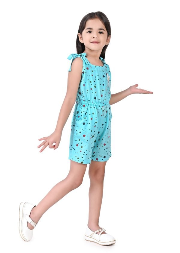 This charming girls’ jumpsuit, perfect for warm weather, features a delightful aqua blue base adorned with a playful scattering of multi-coloured polka dots in shades of black and red. The design incorporates a comfortable, sleeveless silhouette with tie-up shoulder straps, adding a sweet and adjustable detail. A small, contrasting  bow accentuates the bodice, providing a touch of whimsical charm.