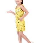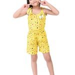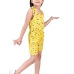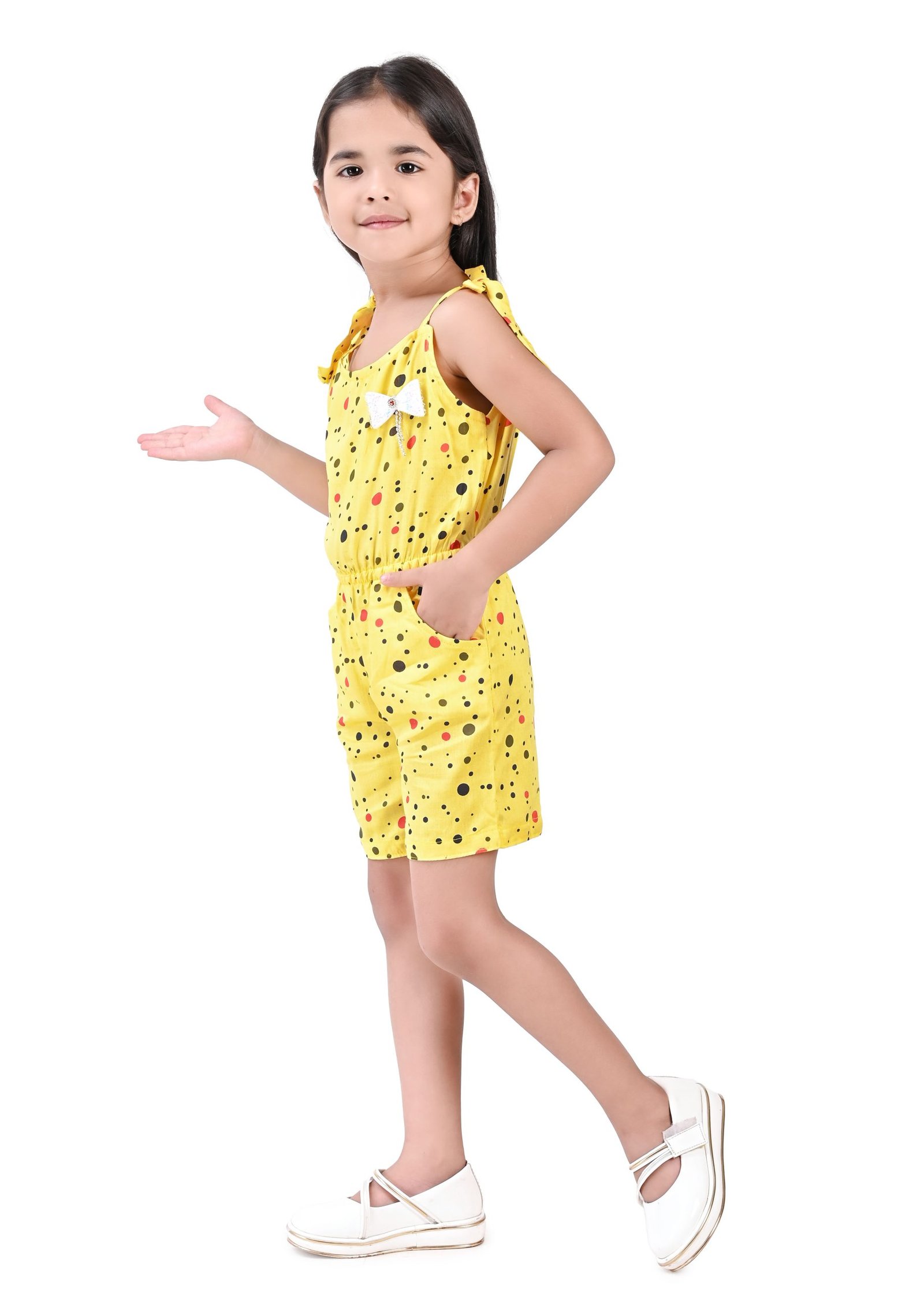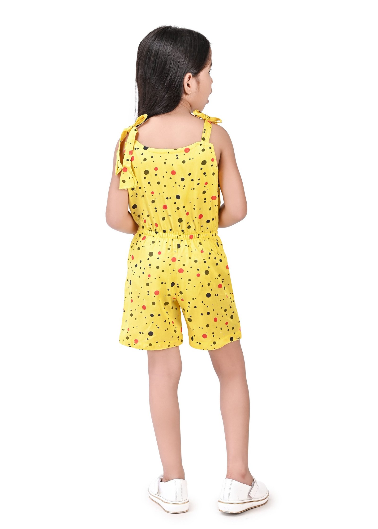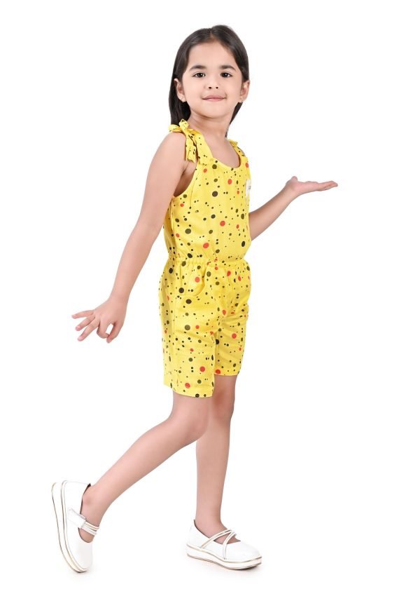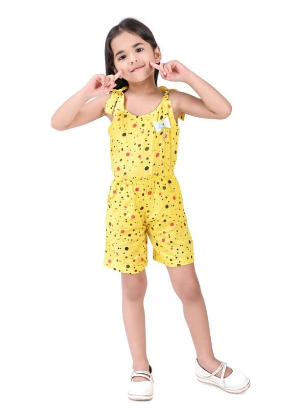 This charming girls’ jumpsuit, perfect for warm weather, features a delightful yellow base adorned with a playful scattering of multi-coloured polka dots in shades of black and red. The design incorporates a comfortable, sleeveless silhouette with tie-up shoulder straps, adding a sweet and adjustable detail. A small, contrasting white bow accentuates the bodice, providing a touch of whimsical charm.