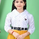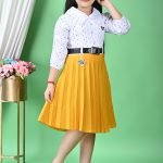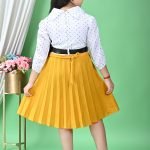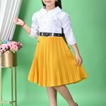 This charming girls’ frock presents a delightful blend of classic and playful elements, perfect for various occasions from casual outings to festive gatherings. The dress features a two-piece aesthetic, though it appears to be a single garment, combining a crisp white top with a vibrant yellow pleated skirt.