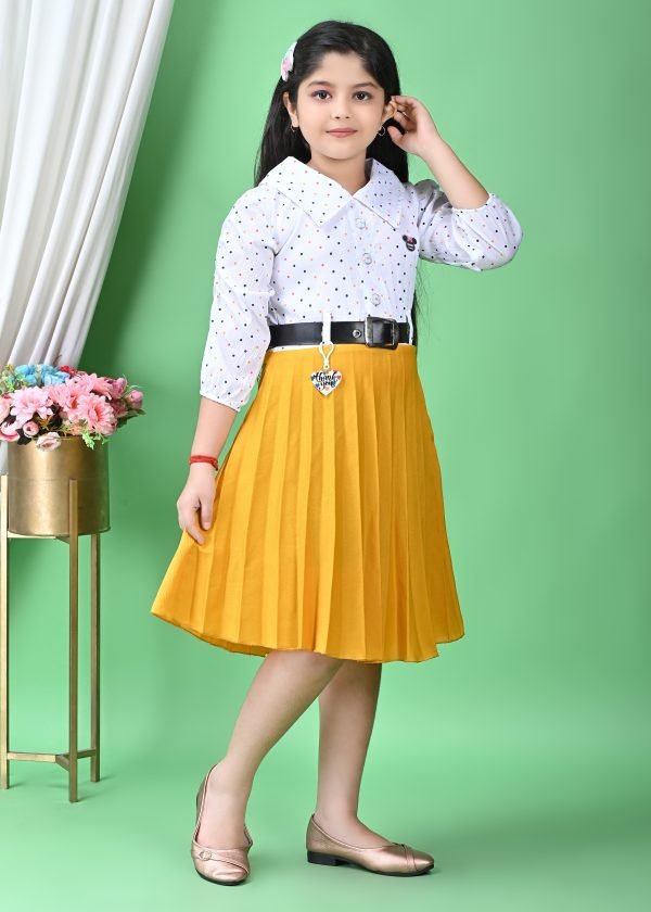 The lower half of the frock is a striking, sun-yellow pleated skirt that cascades gracefully to a midi or knee-length, depending on the wearer’s height. The pleats are meticulously designed, creating a beautiful flow and movement as the child walks or twirls. This bright yellow hue adds a cheerful and eye-catching contrast to the patterned white top. Cinching the waist and providing a neat transition between the two sections is a sleek black belt with a prominent silver buckle. This belt not only defines the silhouette but also adds a touch of sophistication to the overall design. A small, heart-shaped charm, possibly a brand tag or decorative element, dangles from the belt, adding a subtle, endearing detail.