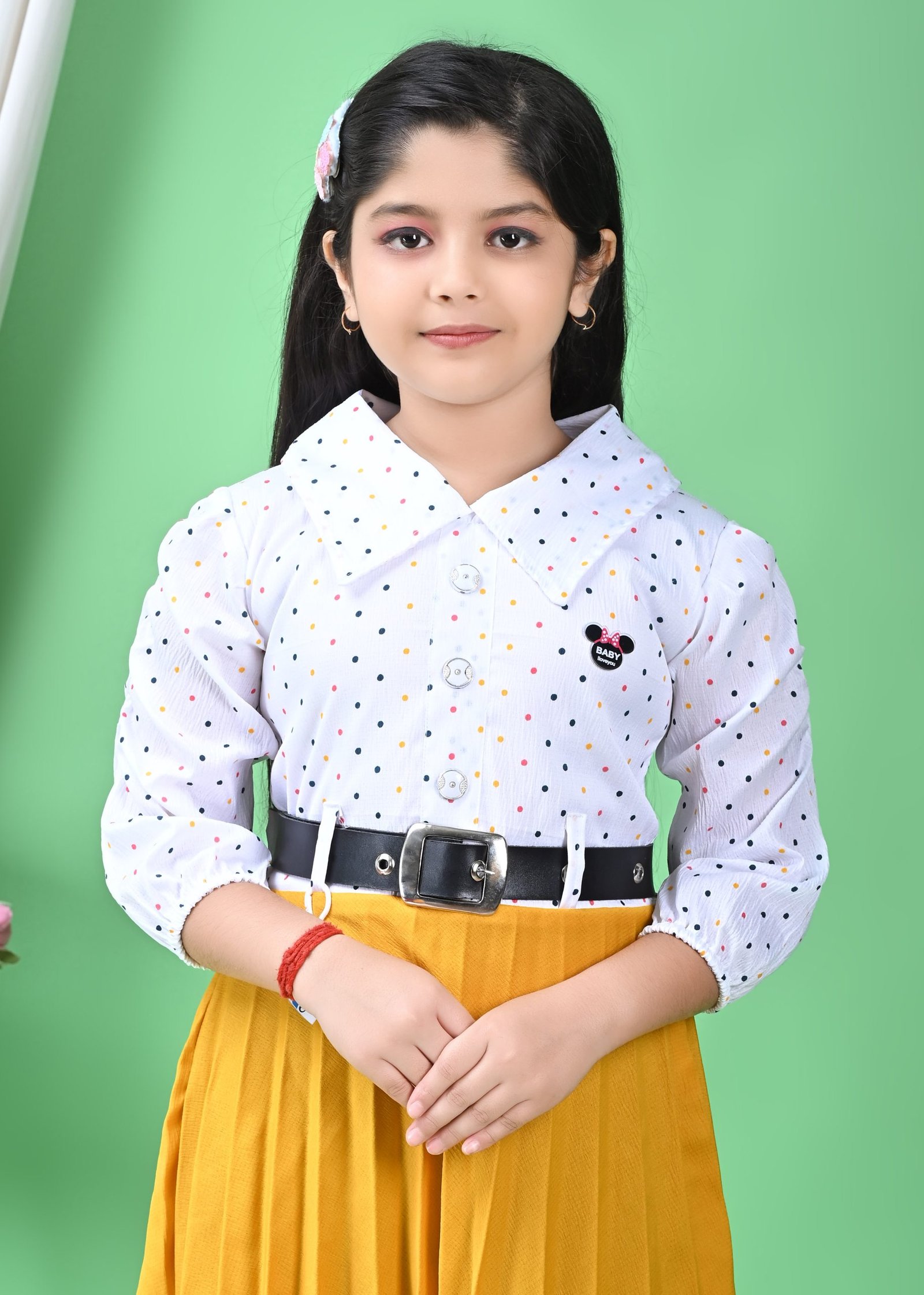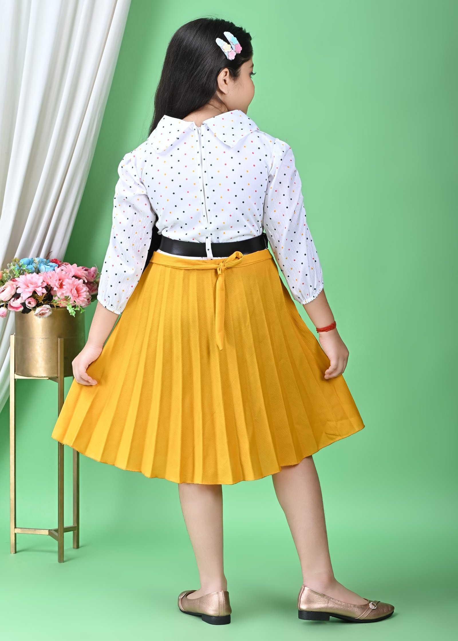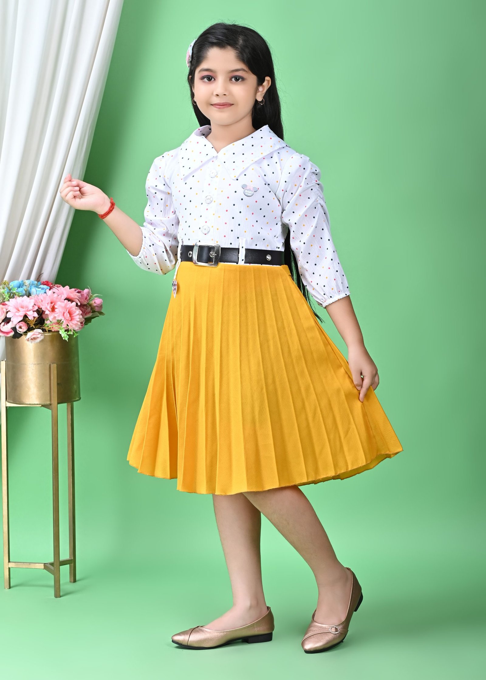 The lower half of the frock is a striking, sun-yellow pleated skirt that cascades gracefully to a midi or knee-length, depending on the wearer’s height. The pleats are meticulously designed, creating a beautiful flow and movement as the child walks or twirls. This bright yellow hue adds a cheerful and eye-catching contrast to the patterned white top. Cinching the waist and providing a neat transition between the two sections is a sleek black belt with a prominent silver buckle. This belt not only defines the silhouette but also adds a touch of sophistication to the overall design. A small, heart-shaped charm, possibly a brand tag or decorative element, dangles from the belt, adding a subtle, endearing detail.